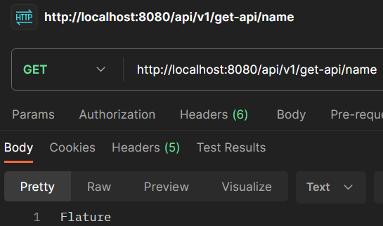 }매개변수가 없는 요청은 http://localhost:8080/api/v1/get-api/name URL을 그대로 입력하고, 정해진 반환값인 "Flature"를 출력합니다.