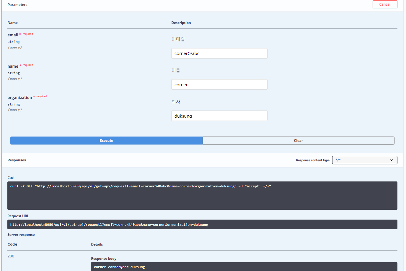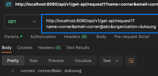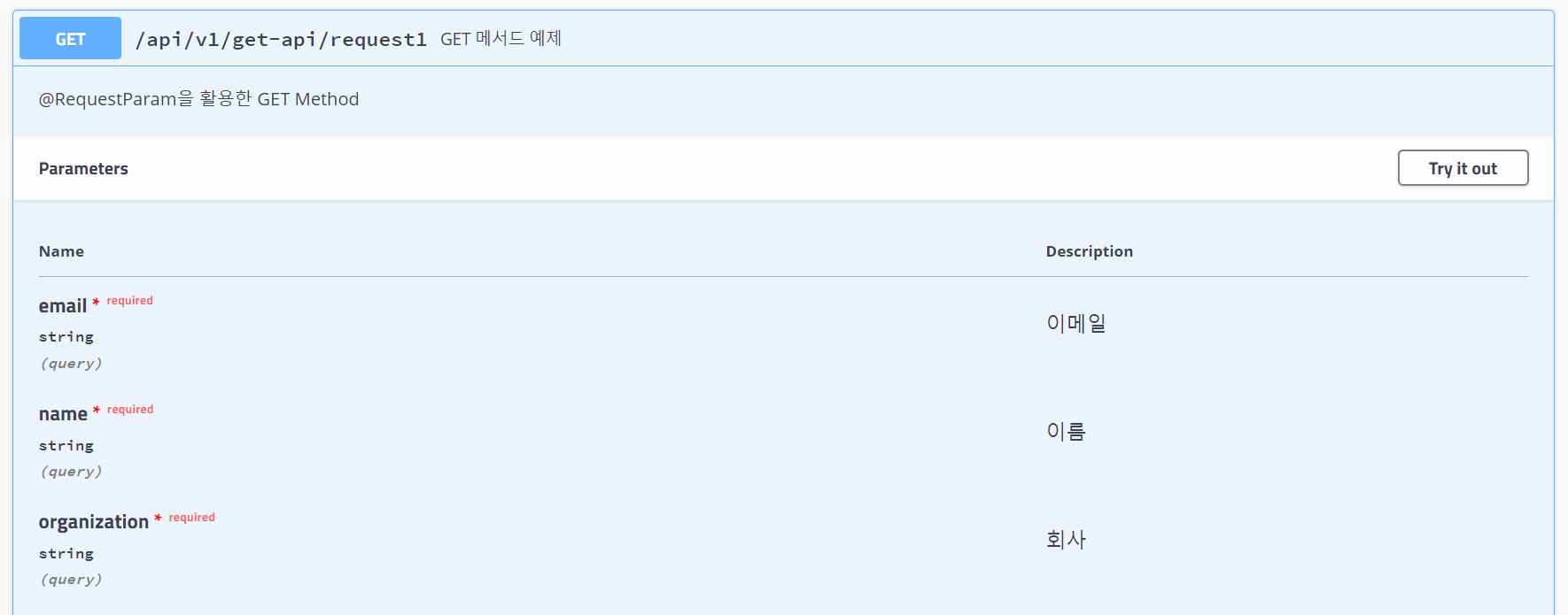 }위와 같이 작성 시 http://localhost:8080/api/v1/get-api/request1?name={값1}&email={값2}&organization={값3}로 getRquestParam1 메서드를 호출할 수 있습니다. '?' 우측에 쿼리스트링(Query String)을 명시합니다. 쿼리스트링은 URL의 물음표 뒤 모든 문자열을 의미합니다. 쿼리스트링을 통하여 메서드의 매개변수에 이름을 매핑하면 값을 가져올 수 있습니다.