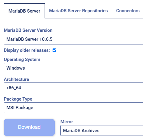 마리아DB 다운로드 페이지(https://mariadb.org/download)에 접속합니다. 각자의 개발 환경에 맞추어 설치 파일을 내려받읍시다. 마리아DB 서버 버전은 10.6.5를 사용하였습니다.