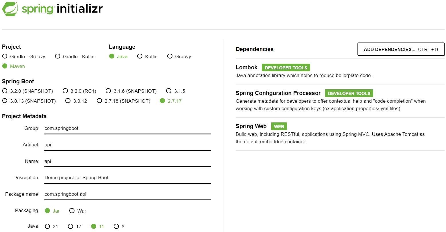 5장에서 실습할 프로젝트를 생성합니다. 4장 4.1.2 스프링 공식 사이트에서 프로젝트 생성하기의 방법과 동일하게 생성하면 됩니다. 그러나 4장과 달리 Group을 'com.springboot'로, Artifact와 Name을 'api'로 설정합니다.