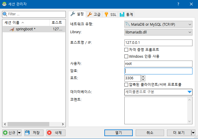 [신규] 버튼을 눌러 우측에 접속 정보를 설정합시다. 세션 이름을 springboot로 입력하고 설치 단계에서 입력한 root 패스워드를 입력하여 저장합니다.