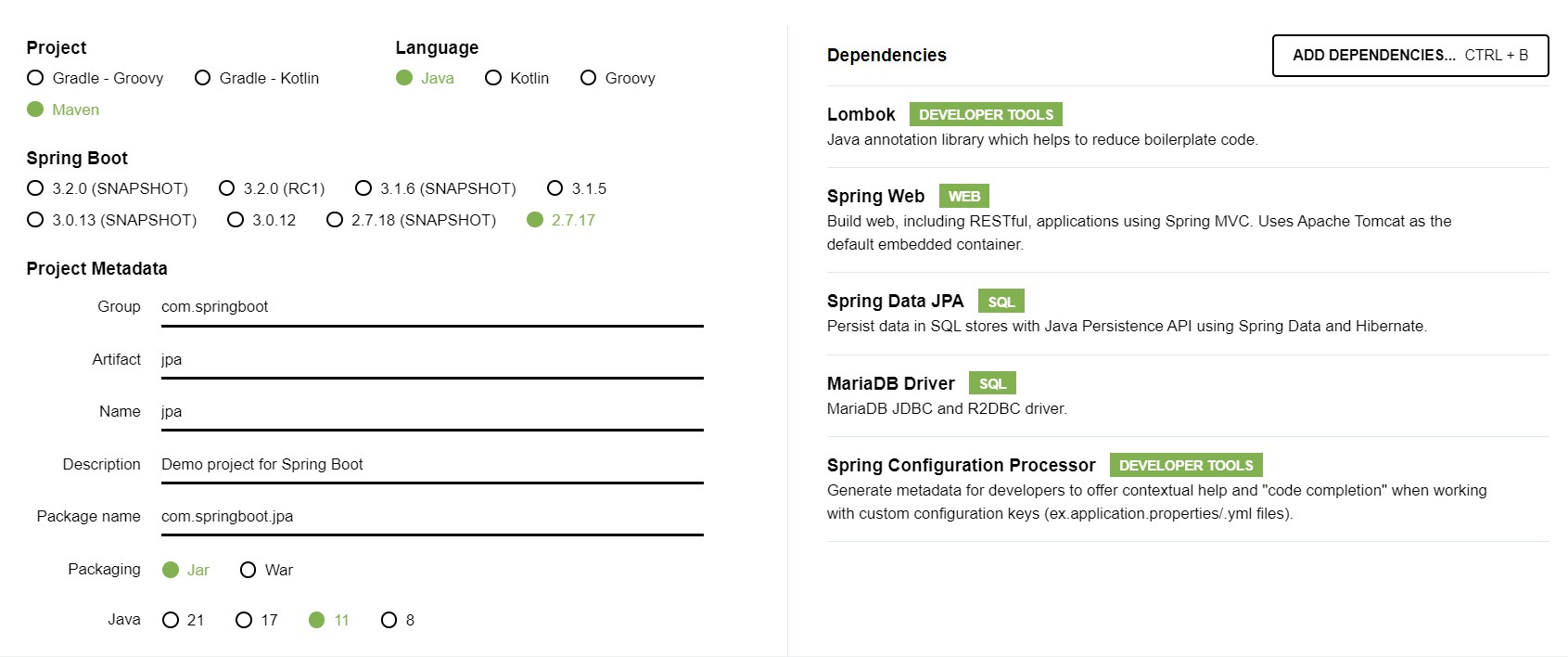 ArtifactId와 name은 'jpa'로 설정하고, 라이브러리는 사진과 같이 Lombok, Spring Web, Spring Data JPA, MariaDB Driver, Spring Configuration Processor를 선택하여 받아줍니다.