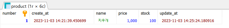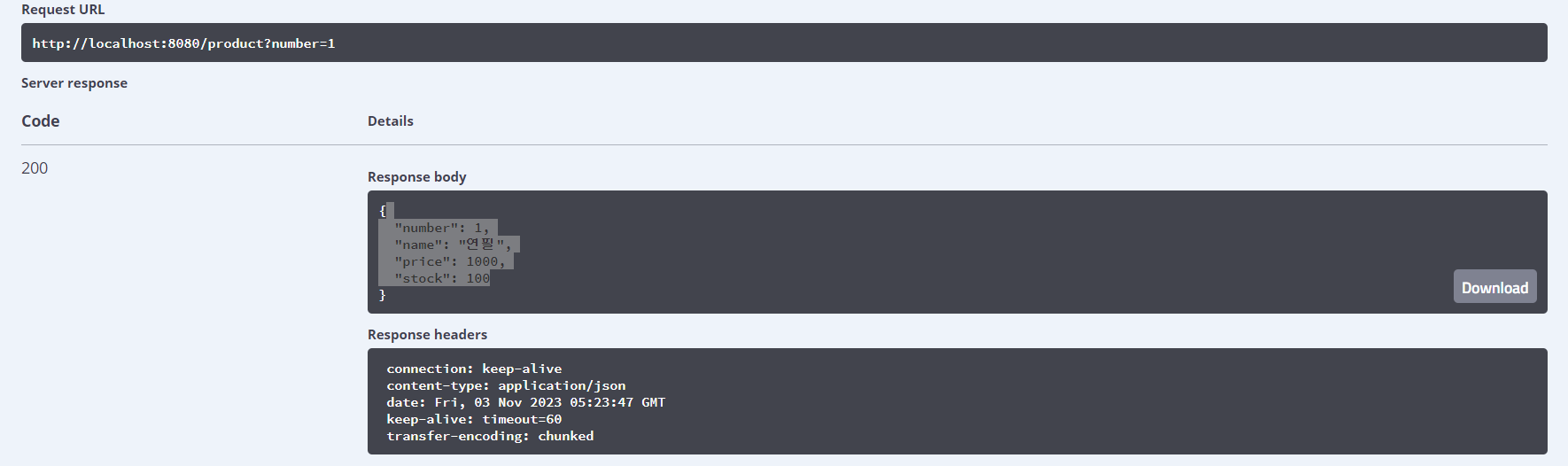 getProduct에서 조회하고자 하는 number 칼럼의 값을 입력하면 아래와 같이 응답 Body에 값이 담긴 것을 확인할 수 있습니다.
