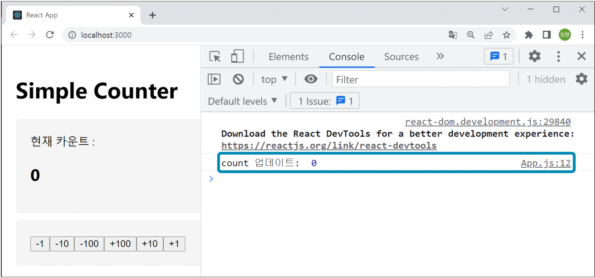두 개의 State 값이 변할 때마다 콘솔에 값을 출력합니다.