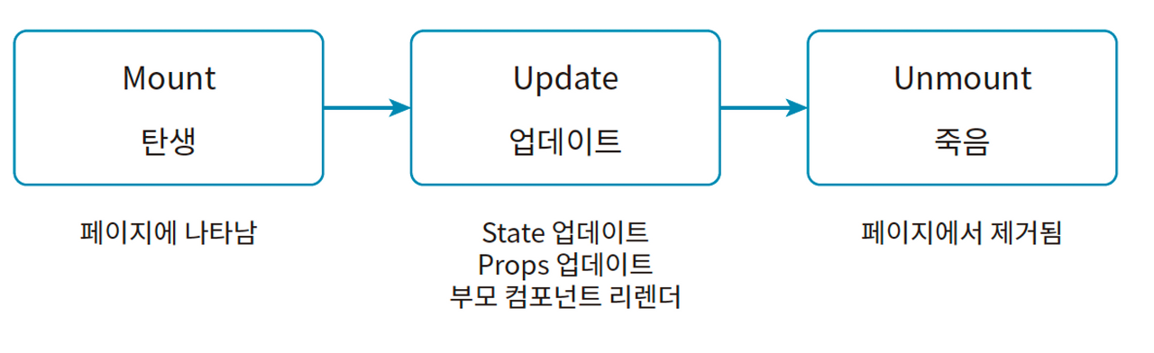 리액트 컴포넌트의 라이프 사이클은 크게 3단계로 구분합니다. 다음 그림은 리액트 컴포넌트의 3단계 라이프 사이클을 도식화한 것입니다.