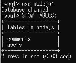 nodejs라는 이름의 데이터베이스를 생성한 다음, use nodejs; 명령어를 추가로 입력해 앞으로 nodejs 데이터베이스를 사용하겠다는 것을 MySQL에 알린다.