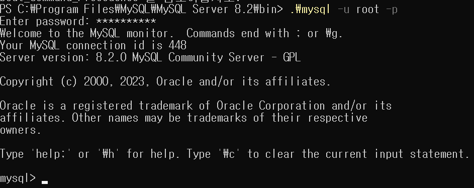 PS C:\Program Files\MySQL\MySQL Server 8.2\bin> 경로로 이동