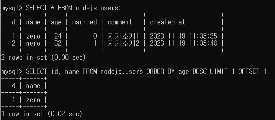 # SELECT name, married FROM nodejs.users; -> name과 married컬럼만 조회