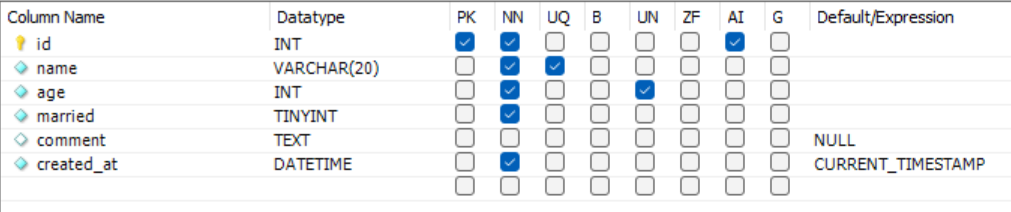 - id, name, age, married로 시작되는 세로줄을 컬럼(column)이라고 하고, 미리 column을 정의해 두고 컬럼에 맞춰 데이터를 넣으면 된다.