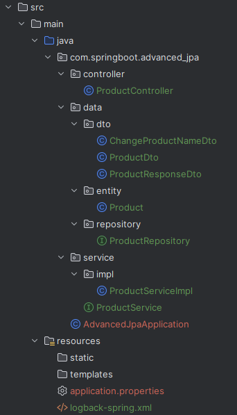 이 코드를 사용할 때는 ProductRepository만 이용하면 됩니다. JpaRepository에서 제공하는 메서드를 사용하거나 ProductRepositoryCustom 인터페이스에서 정의한 메서드를 구현체를 통하여 사용할 수 있습니다. 테스트를 위하여 com/springboot/advanced_jpa/data.repository/support 패키지를 생성하고 ProductRepositoryTest 클래스를 생성합니다.