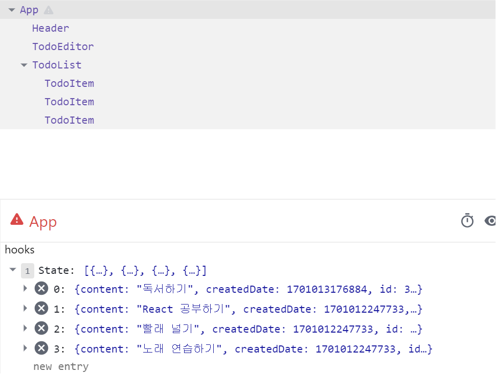 아직 App 컴포넌트의 todo 값을 페이지에 렌더링 하는 Read 기능은 개발하지 않았기 때문에 개발자 도구의 [Components] 탭에서 직접 확인해야 한다.