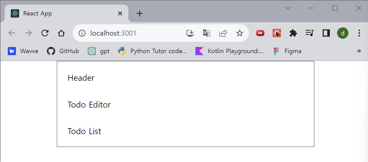 2. App에 배치할 자식 컴포넌트를 아직 구현하지 않았으므로, 임시 요소를 만들어 대신 배치한다.