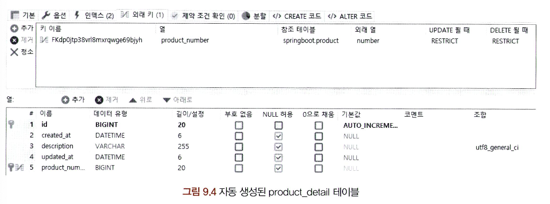 이후에 더 자세히 살펴볼 예정이므로 여기서는 fetch() 요소와 optionaK) 요소만 보자. @0neTo0ne 어노테이션은 기본 fetch 전략으로 EAGER, 즉 즉시 로딩 전략이 채택된 것을 볼 수 있다. 그리고 optionaK) 메서드는 기본값으로 true가 설정돼 있다. 기본값이 true인 상태는 매핑되는 값이 nullable이라는 것을 의미한다. 반드시 값이 있어야 한다면 ProductDetail 엔티티에서 속성값에 예제 9.5 와 같이 설정할 수 있다.