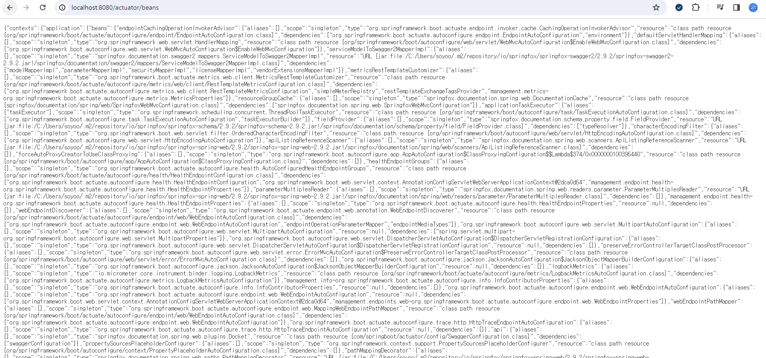 액추에이터의 /beans 엔드포인트를 사용하면 스프링 컨테이너에 등록된 스프링 빈의 전체 목록을 표시할 수 있습니다. JSON 형식으로 빈의 정보를 반환합니다.