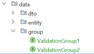 검증 그룹은 별다른 내용이 없는 마커 인터페이스를 생성해서 사용합니다. 실습을 위해 data 패키지 내 group 패키지를 생성하고 ValidationGroup1과 ValidationGroup2라는 인터페이스를 생성합니다. 두 인터페이스 모두 내부 코드는 없으며, 인터페이스만 생성해서 그룹화하는 용도로 사용합니다.