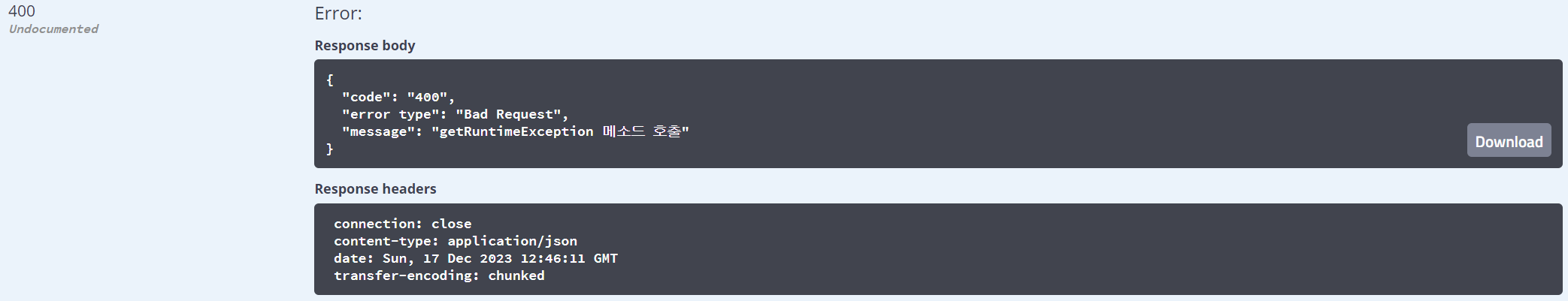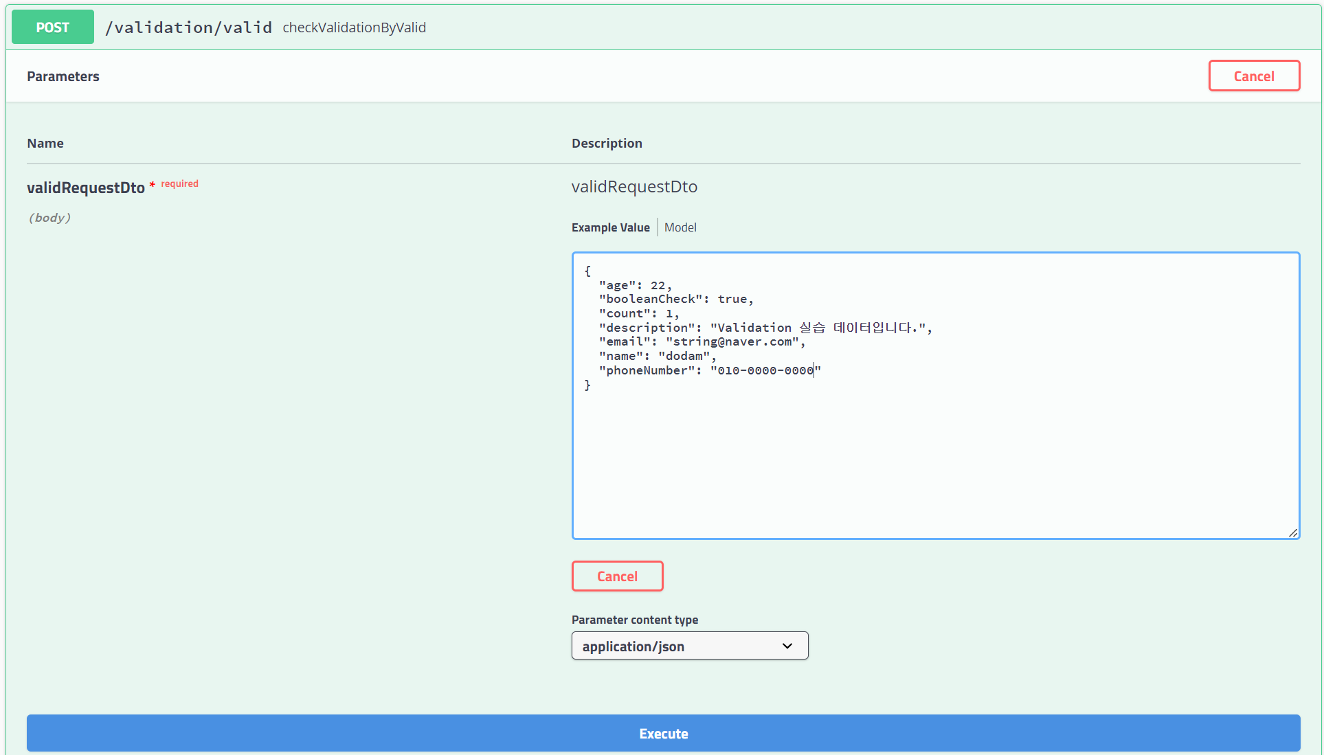동작을 확인하기 위해 Swagger 페이지에 접속하여 값을 다음과 같이 적어줍니다.
