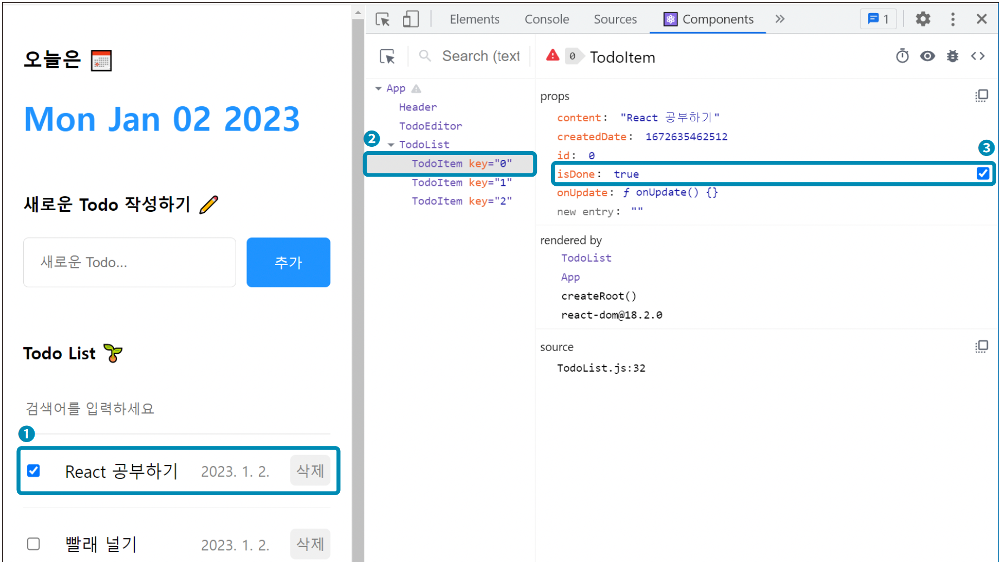 const TodoItem = ({ id, content, isDone, createdDate, onUpdate }) => { // Props를 구조 분해 할당한다.