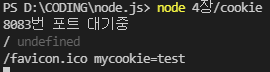 가장 처음에는 req.headers.cookie에 아무 값도 들어가 있지 않다가 한번 response가 돌아온 이후에는 쿠키가 test로 설정된 것을 알 수 있다.
