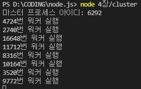 코어 개수에 맞게 워커 프로세스가 실행된 것을 확인할 수 있다.