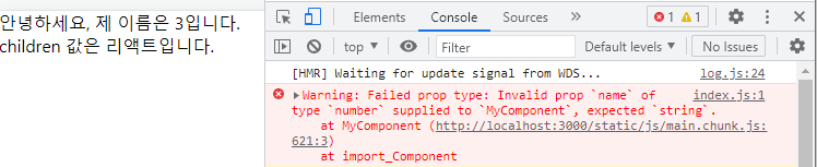 만약 컴포넌트에 설정한 props가 propTypes에서 지정한 형태와 일치하지 않는다면,