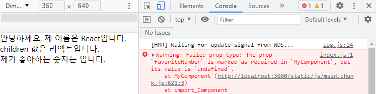 웹페이지에 값이 출력되기는 하지만 브라우저 개발자 도구의 Console 탭에 다음과 같은 경고가 나타난다.