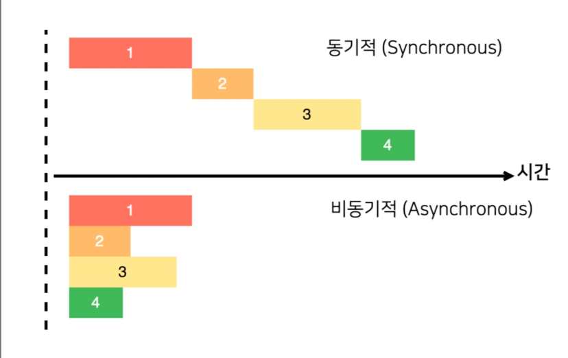 일의 시간에 상관없이 순서대로 일을 완료하는 것을 동기 처리라고 한다. 비동기 처리는 이와 다르게 오래 걸리는 작업을 실행하는 동안 다른 작업을 동시에 수행할 수 있도록 하여 프로그램의 성능을 향상시킬 수 있다.