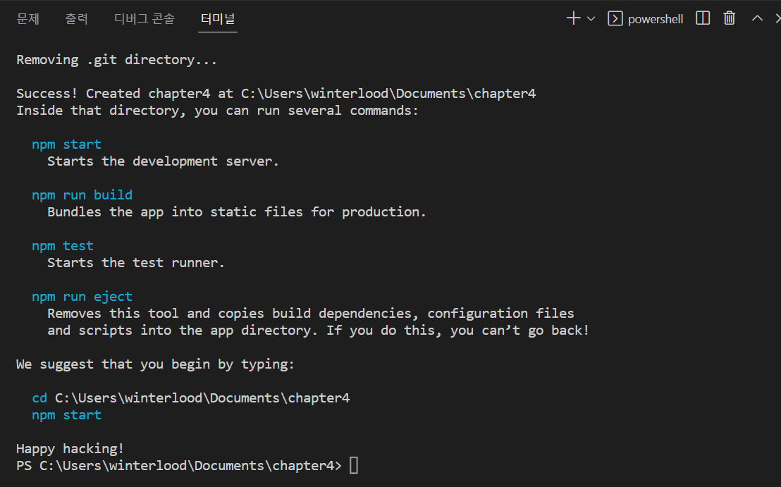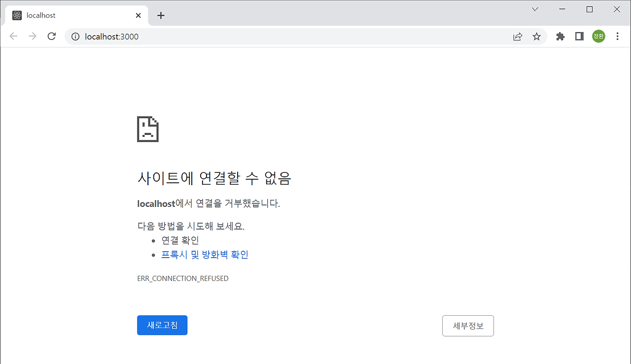 터미널에서 키보드 <Ctrl>+<C>를 누르면 일괄 작업을 끝내시겠습니까 (Y/ N)?라는 메시지가 출력되면, 현재 작업(리액트 앱)을 종료할 것인지 묻는데, 이때 y를 입력하면 종료된다. 리액트 앱을 종료하면 터미널에서 프롬프트가 다시 활성화된다. 리액트 앱을 종료하면, 브라우저에서 주소 http://localhost:3000과의 접속 또한 자동으로 종료된다. 따라서 브라우저에서 새로고침하면 사이트에 연결할 수 없음 페이지가 나온다.