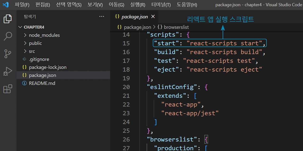 리액트 앱을 실행하는 명령어는 package.json의 scripts에 작성되어 있다.