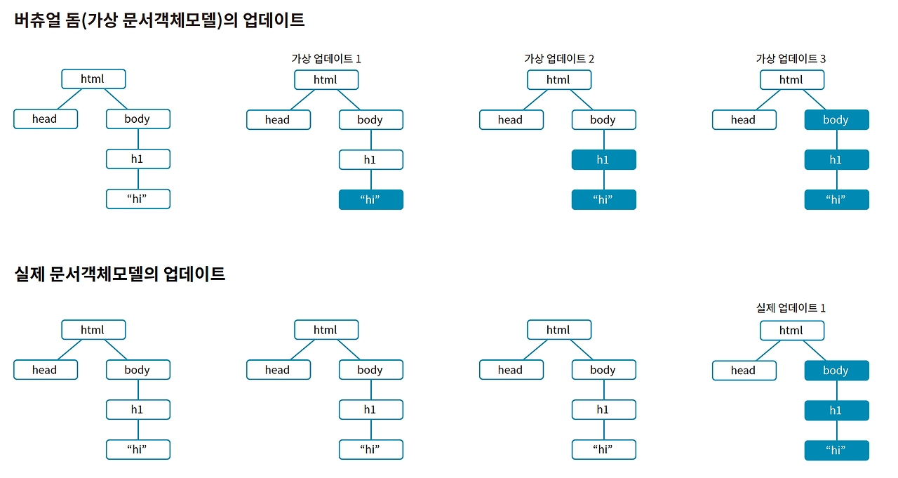 버추얼 돔(Virtual DOM): 페인팅과 레이아웃을 여러 번 수행하지 않으려면 여러 번의 업데이트를 모았다가 업데이트가 필요할 때 한 번에 처리하여 효율적이다.