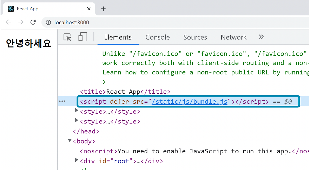 <script>는 리액트 앱에 접속하면 자동으로 index.html에 추가되는 태그다. <script> 태그는 ‘/static/js/’ 경로에 있는 bundle.js라는 자바스크립트 파일을 불러와 실행한다.