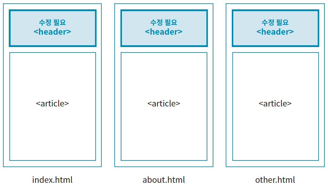 페이지를 추가할 때 <header> 태그 요소는 기존 페이지의 소스 코드에서 복사하여 붙여 넣고, <article> 태그에서 해당 페이지에 필요한 요소만 새롭게 작성하면 된다. 동일한 내용을 여러 번 작성해야 하는 코드를 흔히 중복 코드라고 하고, <header> 태그에서 수정이 생기면, 모든 페이지에서 이 태그를 변경해야 한다. 중복코드가 많이 발생하면 "유연하지 못하다."라고 말하고 페이지의 수가 많고, 기능 수정 또는 추가가 잦은 대규모 애플리케이션을 구축할 때는 적합하지 않다.