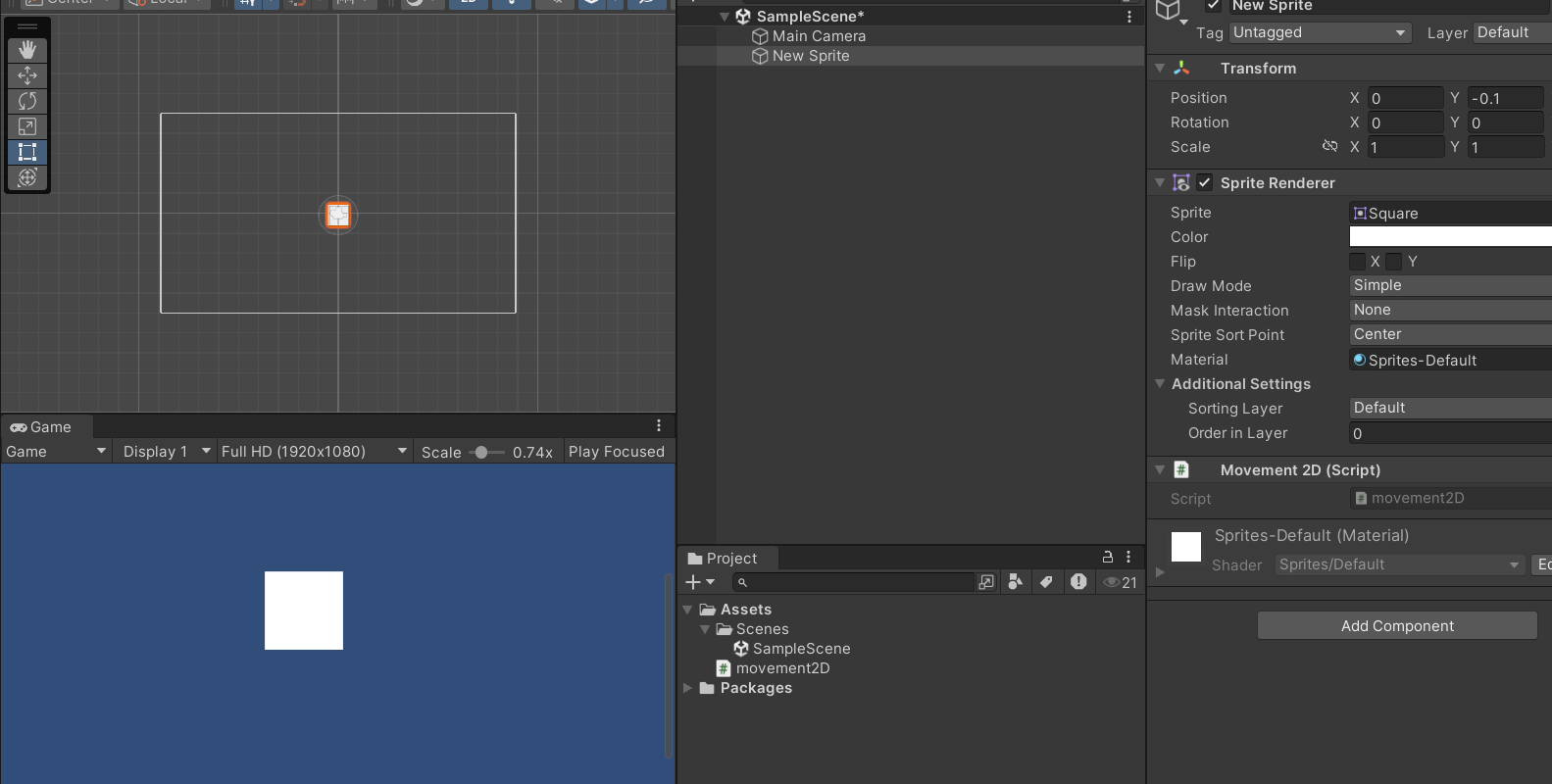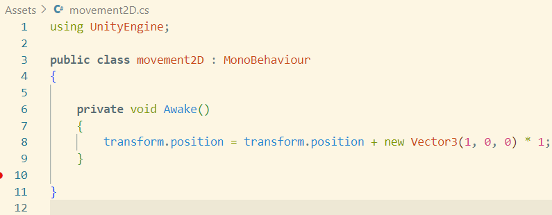 위의 코드는 새로운 위치 = 현재 위치 + (방향 * 속도)라는 것을 의미한다. 그러면 이 오브젝트는 1만큼의 속도로 x축에 이동하게 된다.