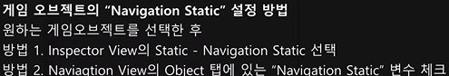 바닥, 장애물과 같은 게임 월드의 정보를 미리 저장해두고, 에이전트가 이동할 때 저장된 정보를 바탕으로 장애물을 피해 목표 위치까지 이동할 경로를 탐색함. 게임 월드에 네비게이션 매쉬를 설정하고, 이동 에이전트가 NavMeshAgent 컴포넌트를 기반으로 이동하도록 설정함