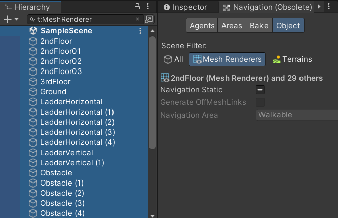 4. Navigation View의 Object 탭을 누른 다음 Mesh Renderers를 클릭하고, 하이어라키에 있는 GameWorld 하위 항목을 모두 선택한 후 "Navigation Static" 변수를 체크해 Navigation Mesh 데이터로 사용 가능하게 함