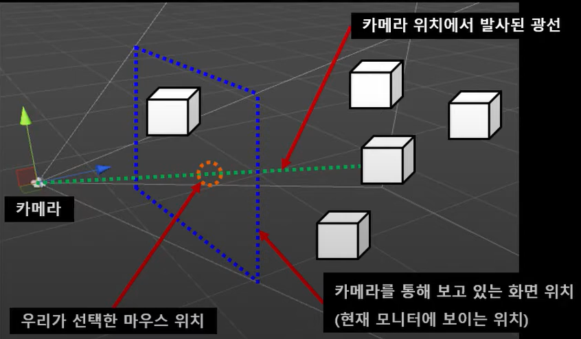 // 카메라로부터 마우스 좌표(Input.mousePosition)위치를 관통하는 광선 생성