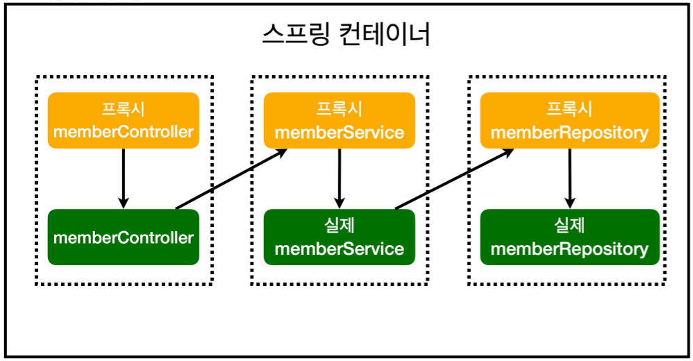 📌 진짜 맴버 서비스가 아닌 Proxy라는 기술이 만들어내는 가짜 멤버 서비스와 연결 ⇒ Proxy 방식의 AOP