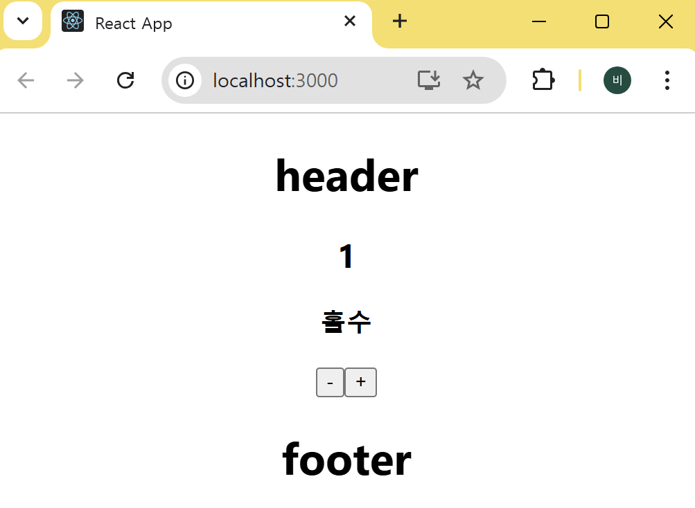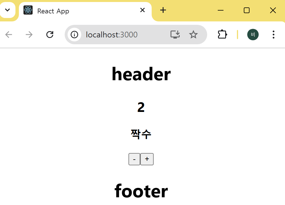 위 코드에서 Viewer 컴포넌트에는 Props로 Body 컴포넌트에 있는 State 변수 number가 전달된다. Viewer 컴포넌트는 조건부 렌더링을 이용해 number의 값에 따라 짝수 또는 홀수 값을 페이지에 렌더링한다. 또한 Body에서 Viewer를 자식 컴포넌트로 사용하고 있음을 볼 수 있다.