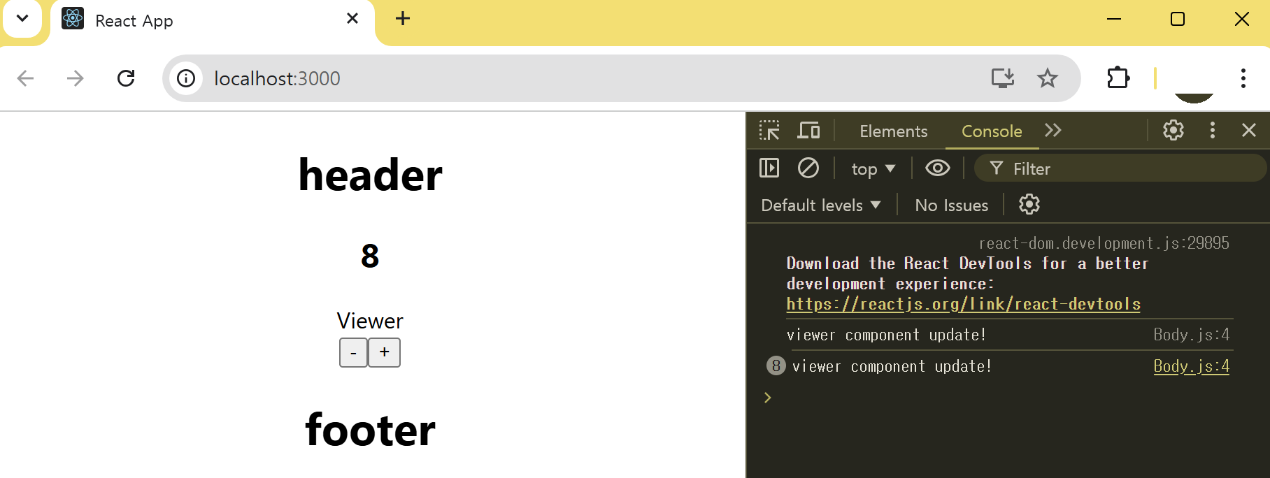 위 코드는 Viewer 컴포넌트가 Props를 받지 않는다. 대신에 console.log를 이용해 리렌더가 일어날 때마다 메시지를 콘솔에 출력한다.