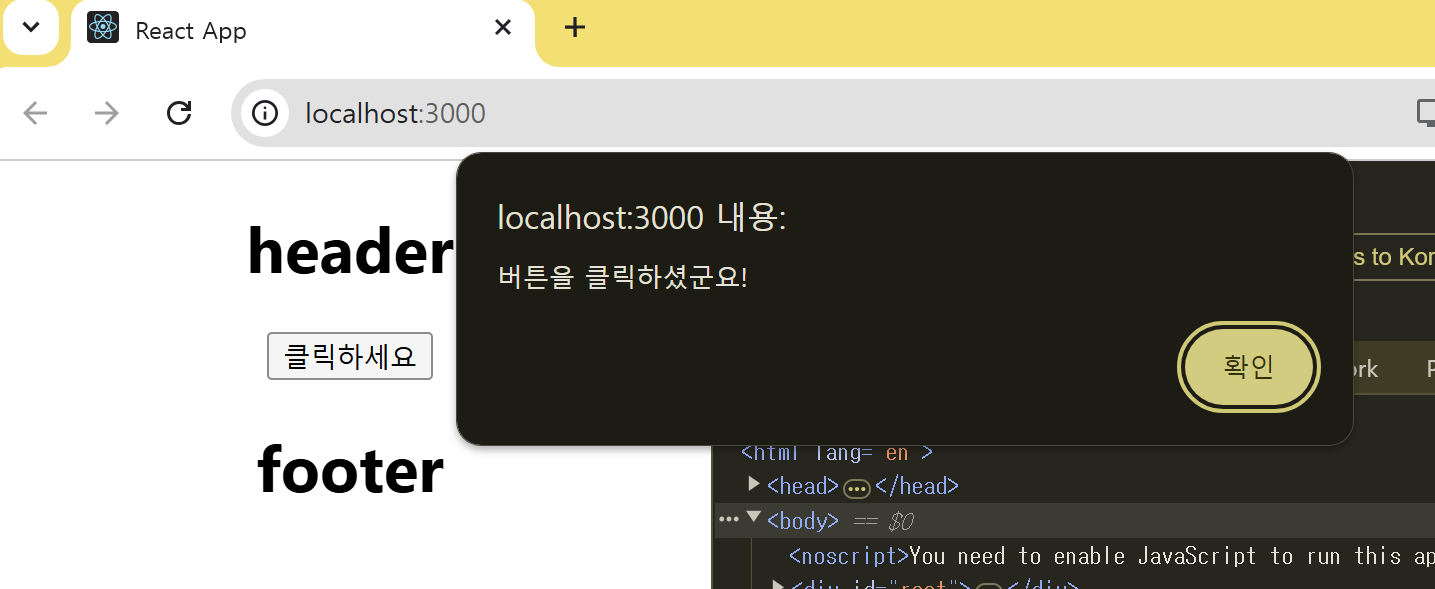 위 코드는 Body 컴포넌트에서 생성된 버튼을 클릭하면 클릭 이벤트를 처리하는 이벤트 핸들러 함수 handleOnClick을 호출한다.