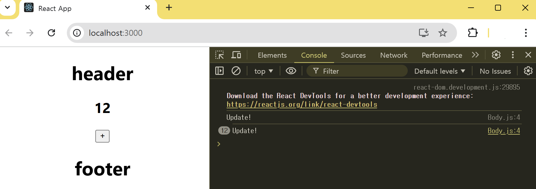 다음은 페이지에서 ' + '버튼은 12번 클릭한 다음 콘솔을 확인한 것이다. 처음 나온 Update!는 컴포넌트를 처음 렌더링할 때 출력된 것이고, 나머지 12번의 Update!는 버튼을 클릭할 때마다 Body 컴포넌트를 다시 호출하기 때문에 출력된 것이다.
