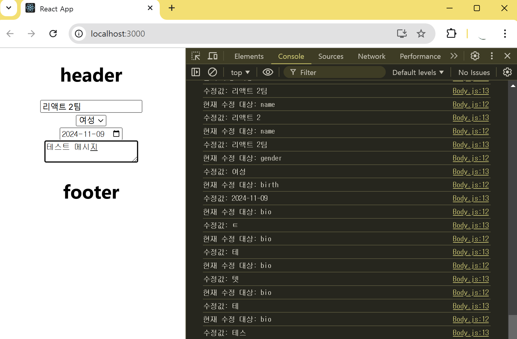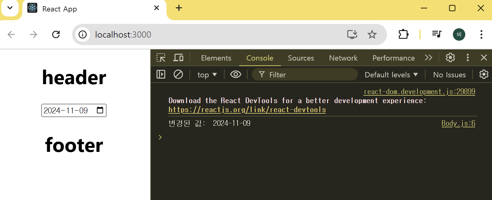 입력 폼에서 날짜를 변경하면 콘솔에서도 변경된 날짜가 바로 출력되는 것을 볼 수 있다.