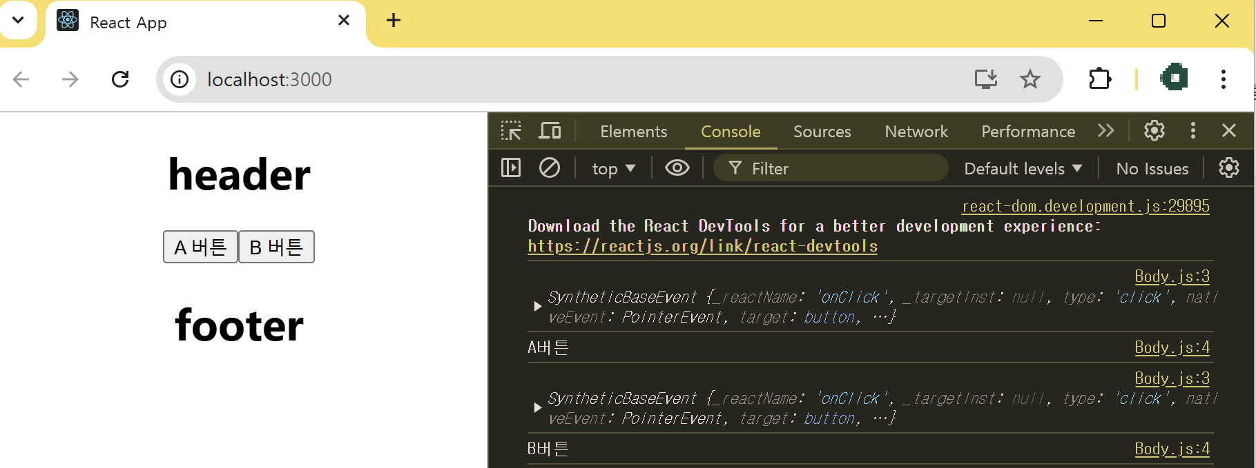 리액트에서는 이벤트가 발생하면 이벤트 핸들러에게 이벤트 객체를 매개변수로 전달한다. 이벤트 객체는 이벤트가 어떤 요소에서 어떻게 발생했는지에 관한 정보를 가지고 있다. 다음은 Body 컴포넌트에 버튼 2개를 만들고, 이벤트가 발생하면 클릭한 버튼의 이름을 콘솔에 출력하도록 하는 코드이다.