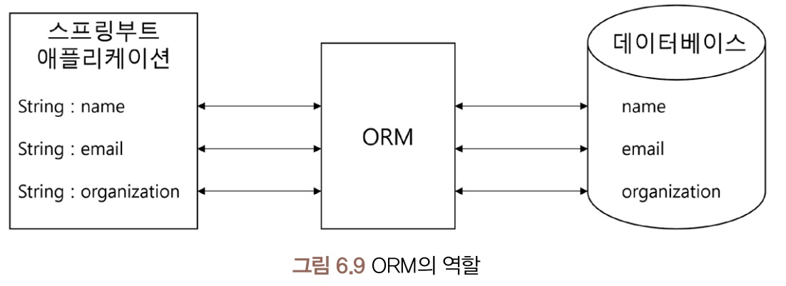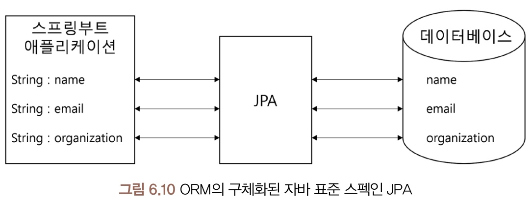 JPA(Java Persistence API): 자바 진영의 ORM 기술 표준으로 채택된 인터페이스 모음. ORM이 큰 개념이라면 JPA는 더 구체화된 스펙을 포함. JPA 또한 실제로 동작하는 것이 아니고 어떻게 동작해야 하는지 메커니즘을 정리한 표준 명세