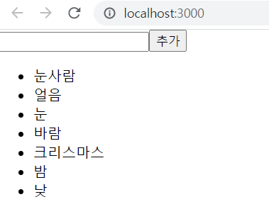 onClick 함수에서 새로운 항목을 추가할 때 객체의 id 값은 nextId를 사용하도록 하고, 클릭될 때마다 1씩 증가하도록 구현하였습니다. 추가 버튼이 클릭될 때 기존의 input 내용이 지워지도록 구현하였습니다.