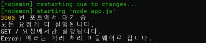 에러 처리 미들웨어는 특별한 경우가 아니면 가장 아래에 위치하도록 한다.
