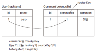 ex) db.User.hasOne(db.Info, { foreignKey: 'UserId', sourceKey: 'id' });