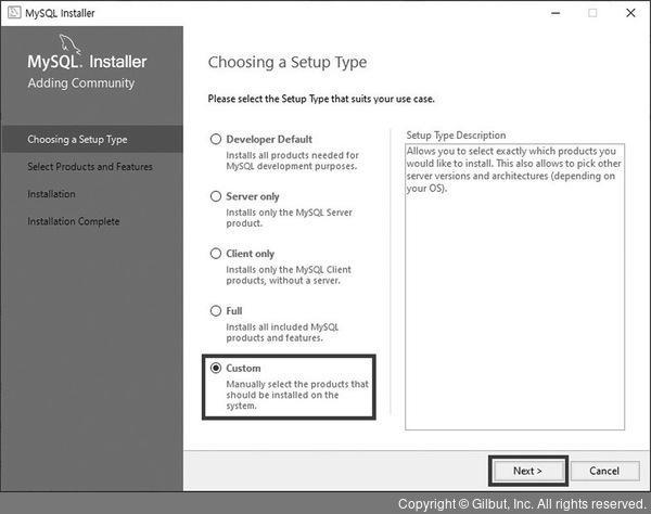 Choosing a Setup Type 부분에서 Custom 선택한 후 Next 버튼 누르기