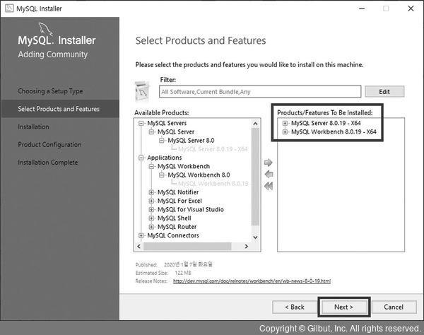 Select Products and Features에서 Available Products: 에서 X86과 X64 중 자신의 운영체제에 맞는 MySQL Server와 MySQL Workbench를 골라 Products/Features To Be Installed:로 옮긴 후 Next 버튼 누르기