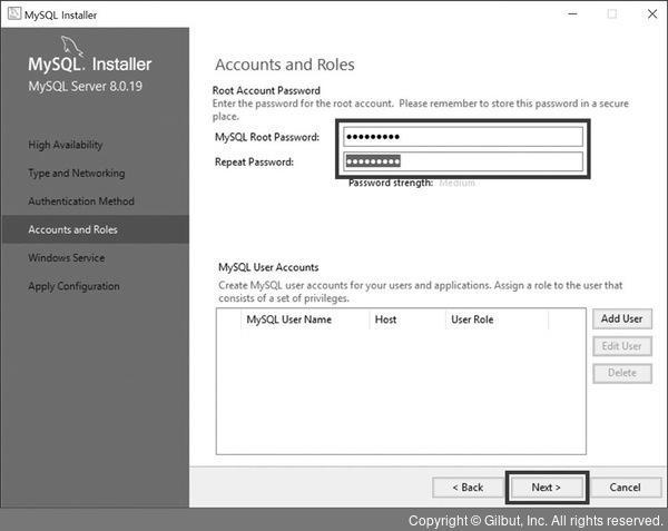 Account Roles에서 Root 비밀번호 설정하고 계속 Next 버튼 누르기