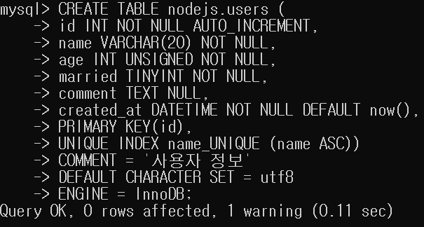 테이블 자체 설정 1) COMMENT : 테이블에 대한 보충 설명 2) DEFAULT CHARACTER SET = utf8; : 한글이 입력될 수 있게 설정 3) ENGINE [MyISAM or InnoDB] : 엔진 지정